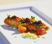 Pancia di maialino in porchetta, bietole, peperoni arrosto e fondo umami